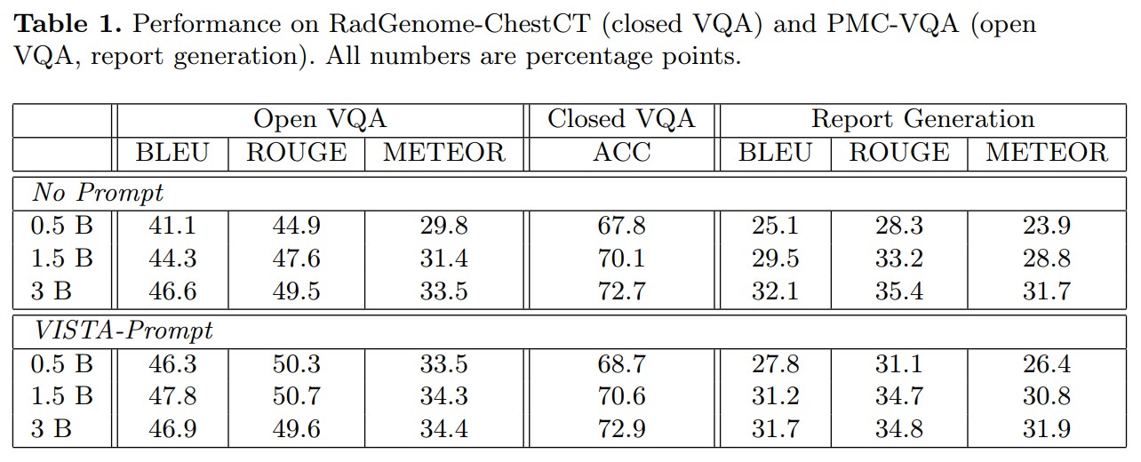 On RadGenome-ChestCT and PMC-VQA, Qwen variants (0.5B/1.5B/3B) with these prompts perform on par with a prompt-free Qwen-7B while cutting GPU memory. Moreover, prompt-guided fine-tuning further lifts closed-ended accuracy and improves open-ended VQA on BLEU-4, ROUGE-L, and METEOR.