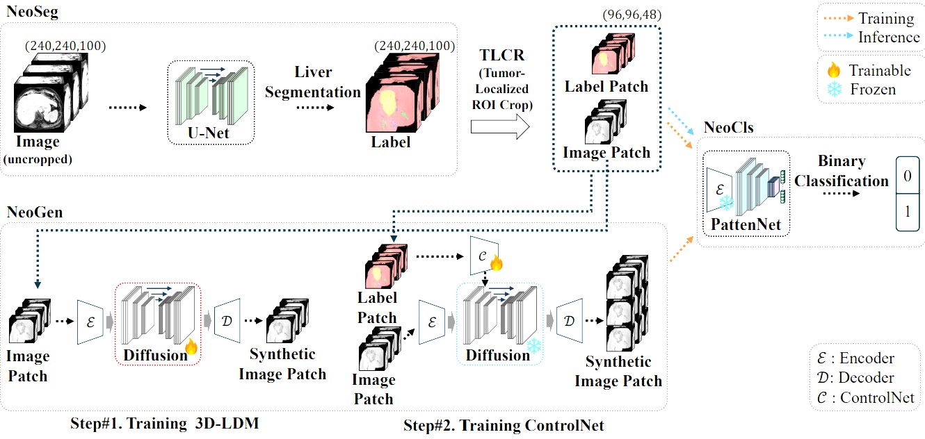 NeoNet integrates three modules: (1) NeoSeg, utilizing a Tumor-Localized ROI Crop (TLCR) algorithm; (2) NeoGen, a 3D latent diffusion model (LDM) with ControlNet, conditioned on anatomical masks to generate synthetic image patches and balance the dataset to a 1:1 ratio; and (3) NeoCls, the final prediction module. For NeoCls, we developed the PNI-Attention Network (PattenNet), which uses the frozen LDM encoder and specialized 3D Dual Attention Blocks (DAB) designed to detect subtle intensity variations and spatial patterns indicative of PNI.