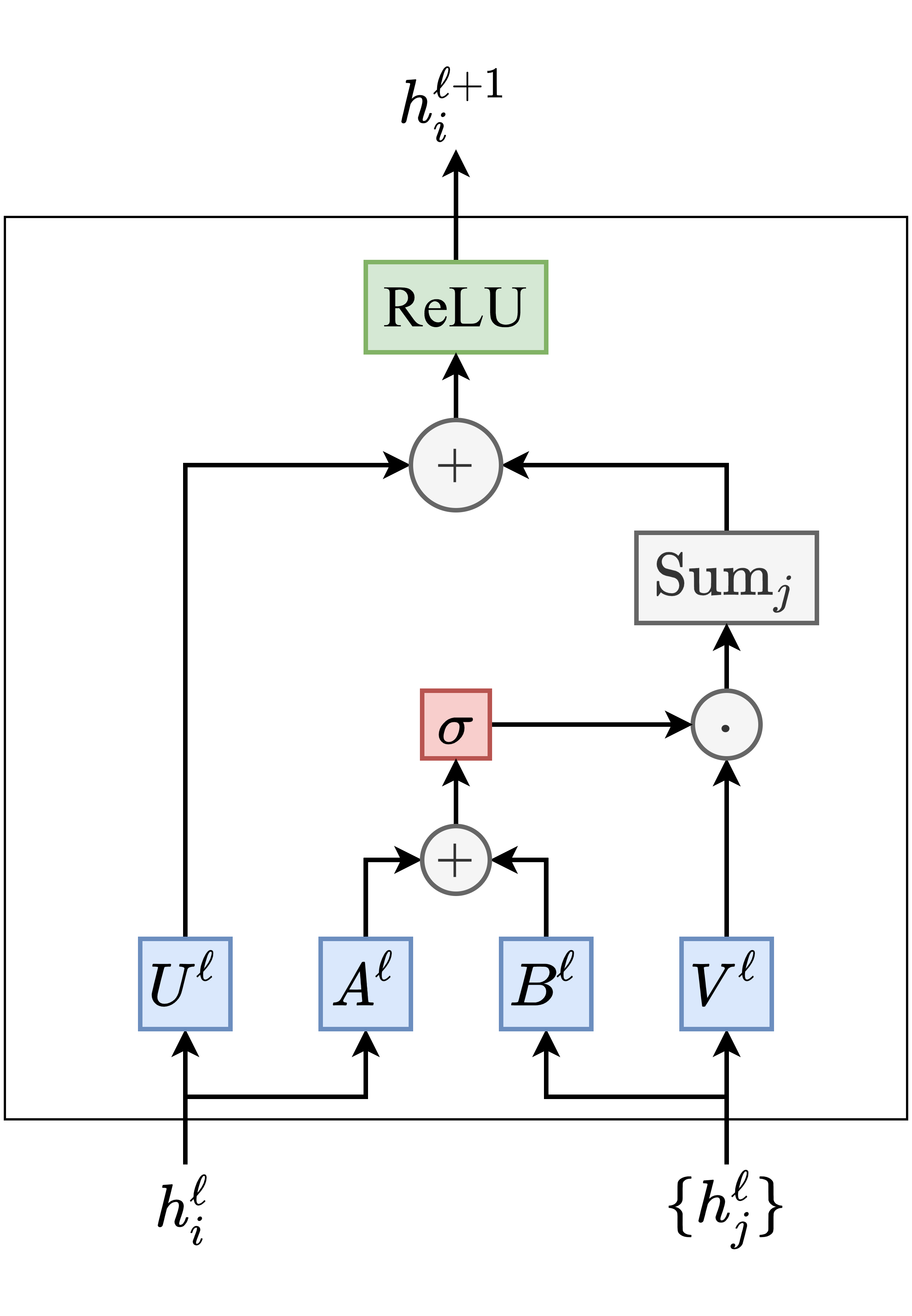 In a recent paper on benchmarking GNN architectures, we introduced block diagrams to intuitively describe feature update equations such as the one above: