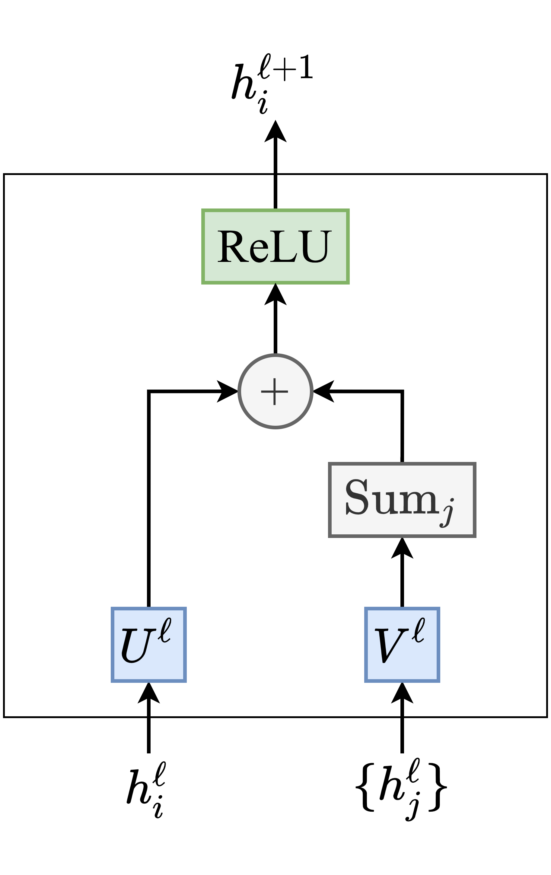 As an illustration, here’s a simple-yet-effective Graph ConvNet from Sukhbaatar et al., 2016: \begin{equation} h_{i}^{\ell+1} = \text{ReLU} \Big( U^{\ell} h_{i}^{\ell} + \sum_{j \in \mathcal{N}_i} V^{\ell} h_{j}^{\ell} \Big), \end{equation} where $U^{\ell}, V^{\ell} \in \mathbb{R}^{d \times d}$ are the learnable parameters.