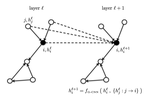Thus, the most generic version of a feature vector $h_i^{\ell+1}$ at vertex $i$ at the next layer in the GNN is: \begin{equation} h_{i}^{\ell+1} = f \left( \ h_i^{\ell} \ , \ { h_{j}^{\ell}: j \rightarrow i } \ \right) , \end{equation} where ${ j \rightarrow i }$ denotes the set of neighboring nodes $j$ pointed to node $i$, which can be replaced by ${ j \in \mathcal{N}_i }$, the set of neighbors of node $i$, if the graph is undirected.